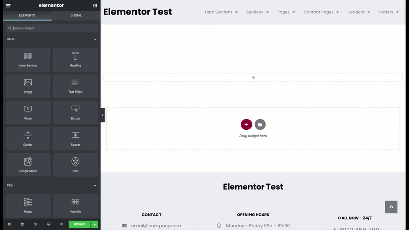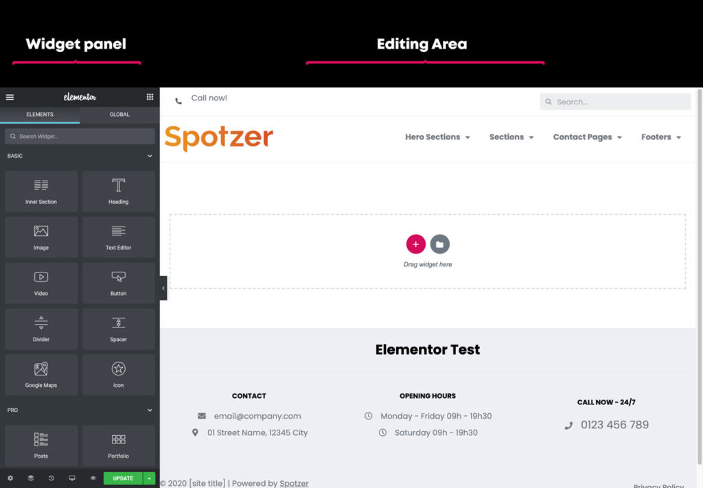 Elementor uses three main building blocks: Sections, Columns, and Widgets.